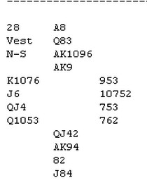 Øst åpnet med 1NT og syd meldte inn 2NT. Nord var litt fraværende og glemte å alertere. Da passet makkeren til 1NT-åpneren og ropte kjapt på politiet når nord straks etterpå våknet fra dvalen og sa at 2NT ikke var naturlig, men to farger. Jeg vet ikke resultatet av saken, men jeg griner blod hver gang noen prøver seg på dette. Ingen hvite, levende mennesker i en forbundsturnering melder inn 2NT naturlig over en sterk NT og det vet også motparten. Da skal en kikke bort på makkeren til han/hun som meldte inn, evt kakke han/hun forsiktig i panna og be hen/henne våkne og forklare, hvis det i tilfelle er ønskelig. Stakkar turneringsleder må nesten følge boka og dømme mot den feilende siden. Slike poeng vil i alle fall ikke jeg ha!!