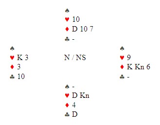Geir visste at makker hadde 3-2-4-4 fordeling og 13-16 hp. De bruker 8-12 NT i åpning i disse soneforholdene. Da hadde de 28-30 hp til sammen og det er mer attraktivt å spille NT på 5-3 i major dess sterkere hendene er. Denne gangen ser Geir at er hjerter kan stjeles på den korte hånda i spar, men makker kan jo ha damen eller Kn10 sånn at det ikke er bruk for stjelingen? Derfor 3NT og ruter åtte kommer ut. Geir ser at i 4sp er det mange sjanser til tolv stikk. Hjerteren kan stjeles og ruteren kan enten kappes på knekten eller knekten kan stjeles god. I tillegg kan det være en skvis i minor. Derfor så han at han nok måtte ha tolv stikk for å få et godt spill. Oppsida var at 3NT med 12 stikk sannsynligvis ville være en svært god score. Geir stakk med ruteresset og presset ut sparesset. Syd vant andre gang og spilte hjerter til esset. Tre ganger spar og nord kaster to kløver og en hjerter, syd kaster en hjerter og en ruter. Så kløver til kongen og kløver til esset. Stillingen er som under.