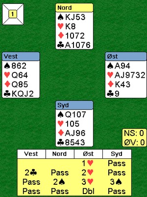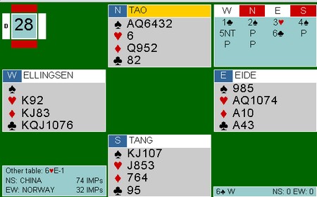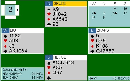 Vi som har lønnet arbeid får ikke all verdens tid til å følge med det som skjer på BBO før mørket senker seg. Jeg er lærer som dere kanskje vet og hvis noen tror at streiken handler om å få gå hjem kl 14, så skal jeg fortelle deg at det handler om å få lov til å jobbe når det er mest behov. For eksempel at du som har små barn skal slippe å komme på foreldrekonferanse kl 13.30 eller at poden din skal få igjen norskstilen eller matteprøven sin noen få dager etter han har levert. Skal jeg måtte gå hjem kl 15.30 hver dag, er ingen av disse tingene mulig. Å rette en bunke matteprøver tar både en og to kvelder, gjerne helga også. Alle andre oppfordrer til fleksibilitet når det gjelder arbeidstid, så skal en yrkesgruppe tvinges inn i et rigid system som ikke passer for noen? Er det ikke rimelig at de som har jobbet to seine kvelder på onsdag og torsdag kan ta 14.45 bussen på fredag siden elevene da har gått hjem? Dette var et partsinnlegg og jeg skal ikke ta betalt for linjene over, Knut Brinchmann. I Tyrkia spilles det svært god norsk juniorbridge. Etter BBO-kamper legges filene ut på nettet og da kan vi i ro og fred se på hvert eneste spill. Jeg er rett og slett imponert over det våre gutter presterer. Kina, som de eldste møtte, spilte både aggressivt og godt. Lilkevel ble de får lette når Ellingsen, Eide, Grude og Hegge satte inn sluttspurten. Her synes jeg Kristian Barstad Ellingsen kom med et panserbud og fikk fortjent belønning. Kineserne satt press på Norge, men det løste vest på en glimrende måte. 5NT betyr "Pick a slam" og viser at han kan spille flere steder. Harald Eide hadde allerede vist fem hjerter og foreslo å spille kløver. Med f.eks 5-5 io rødt, ville han kunne meldt 6ru. Denne gangen ble vi fortjent belønnet når hjerteren satt 4-1. Spar ut og 6hj går beit i praktisk bridge. Det skjedde på det andre bordet. 6kl derimot hadde mye bedre trumf og hjerteren 4-1 var ikke noe problem å håndtere. GLIMRENDE!! Så er det Espen Flått og Christian Bakke som melder en fin 6hj. Uavgjort i denne kampen, men i U25 var det bare ett bord som fant slemmen. Kineserne bar aggressive hele tiden og satt press på det norske laget. I spillet under var de i 5kl før NS fikk sjansen til å utveksle nok informasjon. To udobla beiter var billig mot 4sp hjem på det andre bordet. I Norge pleier vi ikke melde inn med vest sine kort, i alle fall ikke mot en passet makker. Derfor gikk det 1sp - 1NT - 4sp hos kineserne.