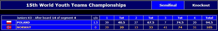No kan eg diverre ikkje skrive meir, då finalen har byrja og vi alle sjølvsagt må fylgje med på Noreg der. Når Israel i år ikkje deltek, må vi seia at Polen frå start var favorittar til å vinne VM i Juniorklassa. Når våre dyktige juniorar greidde å slå ut polakkane, bør det vera gode sjansar for òg å overvinne Nederland – og ta gullet med heim til Noreg.