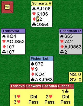 På den siste hjerteren måtte han kaste en kløverhonnør for å holde sparen. Kløver ess felte den andre og kløver knekt ga kontrakt.