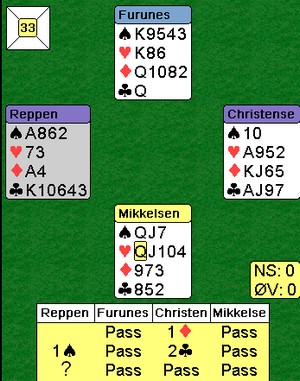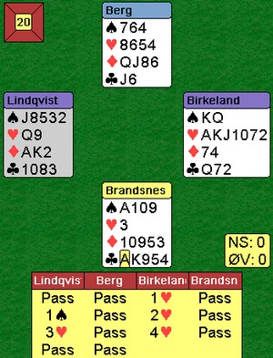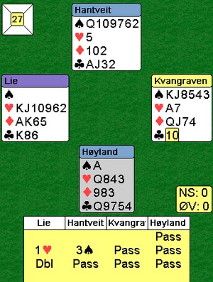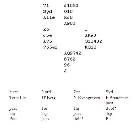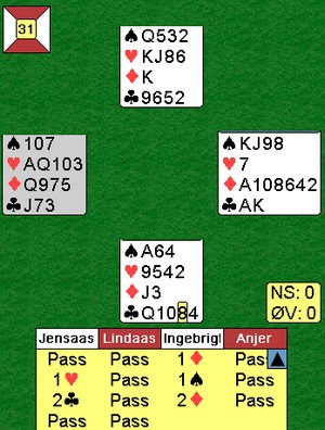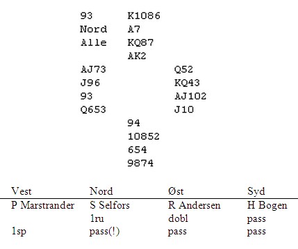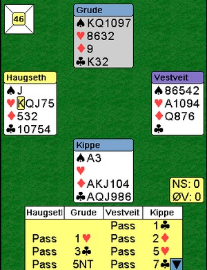 ______________________________________________________________________________________________ Kippe og Grude på vei opp og fram Det er ingen par som har scoret noe særlig. Å lede med 56,2% etter hundre spill, er lite. Dette betyr at det er mange par som er med i medaljekampen når dag to nærmer seg slutt. Selv de med middels enda, kan melde seg på hvis de får i gang sluttspurten. Stillingen etter 34 runder Helge Mæsel er god og myndig TL Nå begynner folk å bli slitne fordi gode spillere melder både fort og dårlig. Denne syd skal få være anonym, men han skammet seg etterpå. Nord viser "litt her og litt der" med sin dobling av 2ru. Da må syd på en eller annen måte komme seg i utgang. 4kl blir bare fight om kontrakten og alt for spedt. Jeg synes 4ru er en god melding som betyr at han har kort for utgang og minst to steder å spille. Aktuelt foreslår vel nord 4sp med dobbelton (har vel benektet tre i forrige runde). Det blir elleve stikk og hele +23 av 25. Selv 5kl med tolv ga +16. Ingen meldte slem, men det er vel ikke så rart. Pass er en undervurdert melding Når bridgespillere finner en steinhard utgang eller slem, roper mange over seg av begeistring. Når de samme tar en råsjans og gjetter på at makker har de ideelle kortene, blir de også (ufortjent?) oppskrytt når det lykkes. Å ta sjansen på at makker ikke har det som passer, er i mine øyne i samme kategori. Ofte kan det ligge en minst like god vurdering bak en pass.