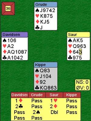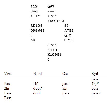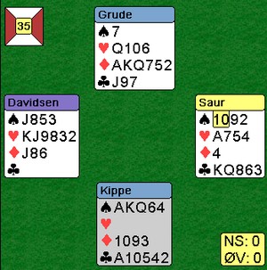 Etter at de var blitt advart mot ruteren, tok de seg altså til den eneste utgangen som hadde sjanser, og spilleføringen fulgte opp de gode meldingene. Det kom tre ganger ruter ut til stjeling, og en kløver til damen satt Syd over. Nå tok Harald den sjansen han hadde: Ut med trumfen og så mer kløver. Std kom inn , men hadde ikke flere ruter, og dermed gode imp til gullgutta.