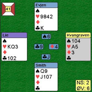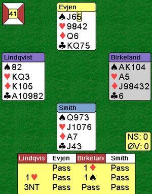 Espen endte i 4 spar som Syd etter 2 kløver åpning fra Nord og fikk hjerter ut til esset. Spar ess og konge avslørte trumfsitsen, og nå fortsatte Espen med hjerter fra bordet. Øst måtte stjele, og trumfen ble tatt ut. På ruter mot bordet stakk Vest opp med esset og fortsatte med en liten kløver. Espen lot seg imidlertid ikke lure og føk opp med kongen. Dermed ble det 11 stikk og et imp inn i stedet for stor utbetaling.