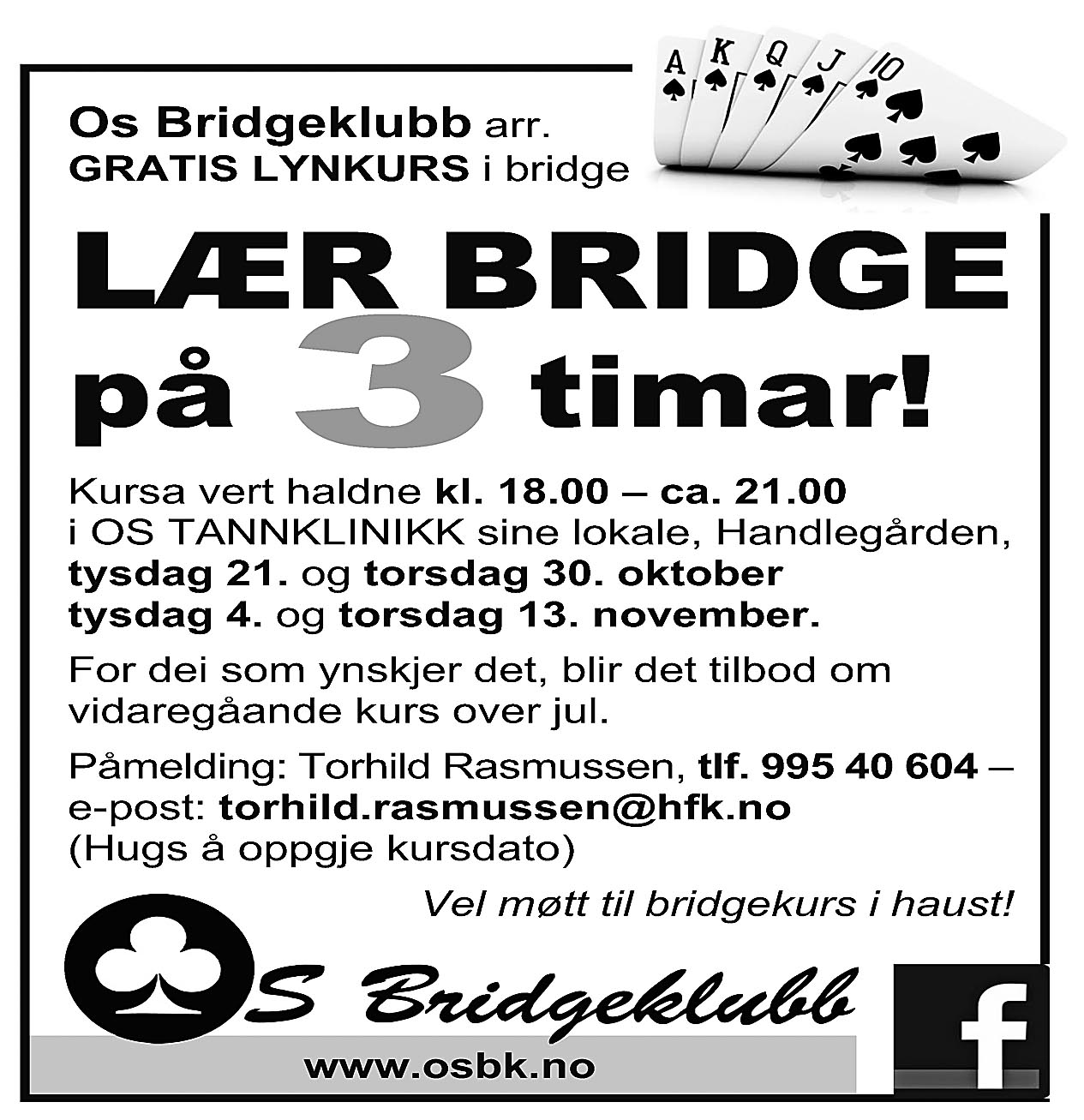 Neste torsdag er det høstferiespilling dvs enkveldsturnering samt at vi legger den inn som simultanturnering og spiller mot hele bridgeriket. Så - vel møtt om en snau uke.