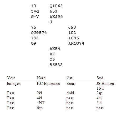 Jeg mener at mange toppspillere noen ganger (ofte?) gjør bridgen for vanskelig. Da jeg bakspilte i NM for et par uker sider, opplevde jeg flere ganger (etter min mening) at de beste parene meldte og meldte på hender der en av dem skulle tatt en praksisk beslutning tidligere i meldingsforløpet. Spesielt i parturnering skal ikke de beste jage de marginale utgangene eller slemmene. Det siste i særdeleshet. Vinner du tolv stikk på en skvis, skal det skje i utgang, ikke på 6-trinnet. Belønningen er sannsynligvis omtrent den samme med 90% score uansett. Straffen er middels i utgang de gangene de sto bare elleve stikk, men rein bunn for beit i slem. Her er et spill som viser hva jeg mener: Jeg tror utfordringen til par som jager det perfekte i sitt system, er at de klarer ikke å begrense hendene ovenfor hverandre. Ingen vil hoppe for å vise ekstra stryke siden det stjeler mye plass. Oftest svært riktig tenkt. Jeg synes det i spillet over er veldig hardt av vest å passere 3NT, men han vil helt sikkert argumentere med at øst har ikke begrenset hånda si enda. Øst kunne helt sikkert kunne hatt både ruterdamen og ruteresset i tillegg når paret enda var på 3-trinnet. Øst vil på den andre siden si at med betydelige ekstra ressurser ville han da tatt opp over en evt. 3NT. En annen ting er at gode par vegrer seg mot på melde NT når det ser ut som kontrakten spiller best fra makkers hånd. Øst ville ikke melde NT med singel kløver og vest ville i melde NT med to små spar. I teorien er dette selvsagt rett, men i praktisk bridge må en noen ganger melde praktisk. Jeg synes at en av dem rett og slett skulle meldt 3NT på et eller annet tidspunkt i meldingsforløpet. (På den annen side er det bare å flytte vest sin hjerterdame over til ruter, så er 6ru en glimrende kontrakt. Likvel tror jeg ikke paret "visste" at de meldte med tolv mot tolv og ingen voldsomme fordelinger på noen av hendene) 6ru er slettes ingen håløs kontakt med de kortene som er. Den står "bare" på å finne ruteren, men en god spiller som Nils Kvangraven vet at det er teoretisk rett å ta kappen. I dette tilfellet marginalt, fordi det ser ut som trumfen må sitte 2-2 siden en spar må stjeles. Det kan kanskje gå an å godspille kløveren for et sparavkast og at en da tåler EDx i syd? Per Elvin Pedersen var i 3NT i spillet fra øst. Der lå K105 i ruter i bordet og øst dro av gårde knekten. Nå syd la liten, tenkte arendalitten at da har han neppe damen og føyk derfor opp på kongen for 11 stikk og 22 av 25 mulige plusspoeng. Toppen gikk til Astrid Margrethe Grønnesby og Knut Jonny Tuseth som vant 6ru med rett trumfvalg. ________________________________________________________________________________ Så til overskriften og praktisk bridge. Det nye 1.divisjonsparet i Kristiansand er Jon Solli Hansen og Karl Christian Baumann. Jon er kjent for akkurat det jeg etterlyser over, en praktisk tilnærming til spillet. Hans styrke er ikke det meldeteoretiske, men han er god til kortvurdering både i meldinger, motspill og som spillefører. Jeg fikk en rein bunn, null prosent på -980, men det lever jeg fint med. Nord har bare ti honnørpoeng, men får vist kortene sine glimrende med 4kl-meldingen. Han spør ikke nødvendigvis om syd har maks eller min, men om det passer med singel kløver. Jon i syd ser at dette henger sammen og vet at alle hans verdier spiller på lag. Enkel, logisk og praktisk bridge. Etter spillet lo kaninen av syd sin åpning med 1NT. "Konsentrerte verdier og ingen gjenmeldingsproblemer gjør at dette er åpning 1kl," sier han. Jeg kan ikke være mer uenig. 1NT er en praktisk og god melding som gjør hånda ferdigmeldt i runde en. Joda, jeg vet at en ikke får tak i den femte kløveren hvis makker spør etter fordelingen, men hvis en åpner med 1kl vil en sannsynligvis få vansker med både å vise kløverfargen og styrken etterpå. Her hører jeg allerede noen systemteoretikere riste på hodet så den knaser i ryggvirvlene, men da kikker du bare på spillet øverst på sida og ser at vårt kanskje aller beste par sliter med å definere håndas stryke. Eller kanskje noen forteller meg hvordan slemmen meldes med styring etter 1kl i åpning og overføringer fra svarhånda?