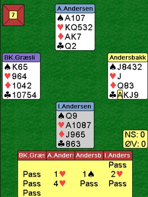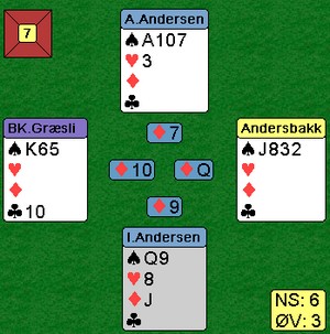 Etter å ha tenkt i 5-6 sekunder ble valget mitt å kaste ruter knekt ettersom det kun var gått en kløverrunde tidligere, og Sigurd hadde saket en kløver på hånda. Ruter hadde vi kjørt noen runder så jeg regnet med at det var tomt og kvittet meg med ruter knekt. Det var selvføgelig feil. Ikke så rart når man tenker i så enkle baner, men da kom Sigurd med følgende tips. "Hadde jeg sittet igjen med kløver dame (det var det manglend kortet) ville jeg ha fisket kongen (kløver A og J hadde tidligere ligget i bordet sammen med 3 små kløver." Så enkelt, men allikevel så vanskelig når man bare er en liten hobbyspiller. Det er slike små innspill på klubbkvelder fra de bedre spillerne som er med på å kickstarte læringskurven og sette i gang nye tankeprosesser. Jeg vil selvfølgelig alltid med to kort igjen i tillegg tenke på om det var noen fiskemuligheter som spillefører ikke benyttet seg av hvis jeg er i tvil om hvilke kort jeg skal kaste neste gang.