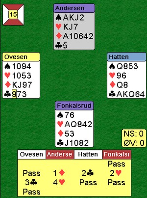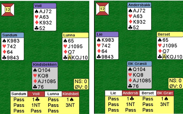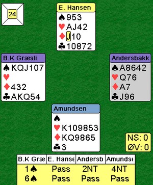 Hva var det jeg sa?? Mange sier jeg er bakstreversk og reaksjonær når jeg stiller spørsmål om moderne meldeteori. Spillene av typen under går ut med en beit i 3NT på de fleste bord. Jeg ser dessverre ikke oppsida med å åpne 1kl i nord. Sorry, men jeg vil heller åpne med 1ru og havne i 4sp/5ru på slike kort. Det er sikkert fordi jeg har passert de femti. Begge øst spiller ut esset. Det hadde gått like fint med fjerde høyeste (knekten) eller norske utspill (tieren) Nesten har aldri metta hesten Her spilte Alf Andersen fint mot lederne av Rondacupen - Lag. Det kom kløver ess ut og skift til trumf. Den stakk han i bordet (syd) og spilte mer kløver til dame og konge. Kløver knekten ble trumfet og trumfen tatt ut i to runder. EK i ruter og ruter mot knekten i posisjonen til høyre. Øst måtte stikke og hadde bare spar igjen. Det som var litt trist for nord, var at han hadde hørt øst melde inn 1sp i sonen. Derfor mente han det var mest sannsynlig at han hadde kongen og gikk derfor i med bordets dame. Ei beit, til tross for alt strevet.