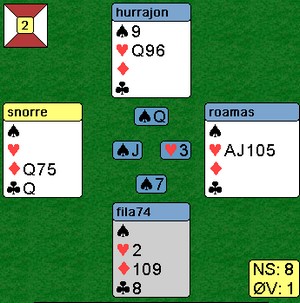Ikke at det var det vanskeligste spillet i verden, men likevel Han stakk kløveren med esset, spar konge, spar til esset og ruter. Jeg stakk med esset og spilte mer kløver til kongen. Jon stjal en kløver, tok for ruterkongen og ut med trumfen i posisjonen under. Nå var det bare å spille hjerter og hjerter dame ga det tiende og siste stikket.