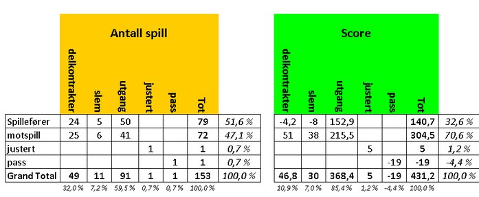 Dette arbeidet som jeg viser her, er noe jeg tror mange par burde tatt seg jobben med å gjøre. Ikke minst for landslagskapteiner og coacher er jeg sikker på at det er interessant å se hvor de enkelte par har sin styrke. Skal dette brukes i noen skala, er det viktig å ha mange spill som datagrunnlag. I en og en turnering vil nok tilfeldighetene slå ut, men klarer en å gjøre dette fra mange turneringer, er jeg sikker på at konklusjonene blir mer og mer pålitelige. Nils Kvangraven er en aldri så liten racer i Excel og han tok utfordringen min med å gå gjennom egen innsats i NM par 2014. Her er resultatene og under forklarer jeg kort. i orange ser du ANTALL SPILL og i grønt er det fokus på SCOREN. Jeg hadde trodd at et par som Nils og Terje var spillefører i mer enn 51,6% av spillene, men det var de altså ikke denne gangen. De andre resultatene er jeg ikke veldig overrasket over. De scorer +140,7 på egne spilleføringer, desidert mest når de er i utgang. De har minus på slemmene og det har jeg sagt noe om før. Selv vil de nok hevde at dette er tilfeldig, men jeg er ikke sikker. Legg også merke til at de har pluss på motpartens slemmer. Enkelt forklart: Også andre par melder for hardt. Jeg ville trodde de var flinke til å karre til seg gode delkontrakter, men det ser ikke ut til å stemme. I alle fall ikke denne gangen. Så scorer de hele 70,6% av plussen sin på motspill. Det var jeg sikker på var den største styrken, fordi det er ofte i motspill en ser forskjellene på de beste og de nest beste. Gode signaler, god oversikt og flink til å telle. Flere som har lignende analyser over egen innsats?