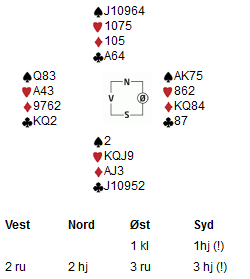 Hva betyr 6kl og hva melder du nå? For å ta teorien hvis noen ikke er kjent med RCK-Blackwood. Hvis hjerteren hadde vært støttet, ville 6kl spurt etter tredjekontroll i fargen. Her er ikke hjerteren støttet, men syd har vist en halv meter der. Nils har ikke fått sjansen til å vise hånda si, men han meldte "bare" 1sp. Det kan han gjøre på veldig sterke hender, men 1sp er ikke 100% krav. Jeg har snakket med tre av våre aller beste. De kommentarene kan du se under. Logg deg på du også og kom med din melding..