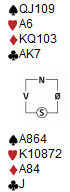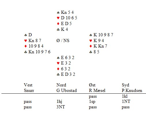 Vest var litt uheldig og valgte spar ut. Jeg tok fire ganger spar og kastet alle kløverne nmine. Øst stakk den fjerde med hjerter ti og spilte kløver som jeg stjal. Ruter til damen og hjerter som Øst stkk med esset og prøvde seg med en kløverhonnør til. Da kunne jeg imidlertdi trumfe, ta ruter konge og ruter til stjeling, pg med stående spar fra bordet, kunne ikke Øst få mer enn ett stikk til. Et enda pussigere trekk ved spillet var at det ble spilt hjerterkontrakt også ved det andre bordet - men denne gang Ø-V! Der åpnet NOrd med 1 NT, Øst gikk inn med 1 NT og ble doblet av Syd. Øst tok jut i 2 hjerter, ble selvfølgelig doblet igjen, men klarte å karre seg unna med to bet - 7 imp til oss.