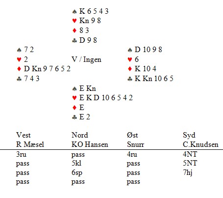 Jeg spilte ut min spar dame som Per stakk og fortsatte med hjerter til tieren. Roald Mæsel stakk og spilte mer hjerter, beste motspill (evt. kløver). Nå tok lyngdalingen tre ganger hjerter og tre ganger kløver. Han smilte bare der han kikka bort på luringen og kunne velge hvilken farge å spille han i inn. Roald holdt Kx i ruter, men da fikk han komme inn i spar og måtte gi bordet de to siste på ED i ruter. På det andre bordet var Kristiansand mer artistiske og spilte på hjerterkongen dobbel i øst etter omtrent samme meldingsforløp. I stedet for hjerter til tieren, slapp spillefører en liten hjerter rundt og fikk dermed to hjertertapere og ikke tempo til innspillet. Her var det Calle og Karl Olav som brillierte Calle godspilte den femte sparen for et kløveravkast. 13 stikk og +1510. Kristiansand's syd hoppa til 6hj etter akkurat den samme innledningen. Jeg satt i øst og angrer veldig for at jeg sa bare 4ru. 5ru hadde gjort det verre, men jeg hadde så mye kort at jeg så ikke for meg lilleslem en gang.