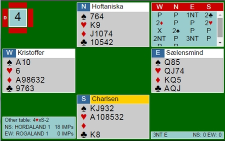 Dette spillet viser at det kanskje ikke er så lurt å spille odde konvensjoner i nye makkerpar. Silla og Christer Kristoffersen tror jeg ikke har spilt særlig sammen før, og når Geir Helgemo ikke stiller denne helga må lag Hauge mikse rundt på parkombinasjonene. Jeg ser at Silla og Christer har avtalt "Hopp til tre-trinnet etter 1NT, viser singelton". Så tipper jeg at avtalene stopper der og resten må sunn fornuft overta. Da går det sånn: