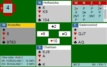 Dette spillet har jeg fått oversendt av Calle Knudsen. Thomas Charlsen spilte ut en spar til tieren som stod. Nå så det ut som det var minst ni enkle stikk, men 4-0 i ruter var ikke greit. Uansett måtte Silla godspille ruteren og inne på den fjerde fortsatte Hoffa med spar til singel ess i bordet.