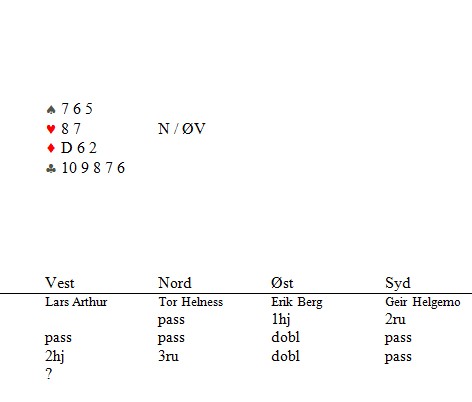 "Kunne vi klart å meldt denne slemmen?", spurte Lars Arthur. Jeg vet ikke, men skulle det være sjanse så må Erik tolke passen på 6hj som singelton og EK i ruter? s