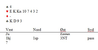 Quiz 1 Først skal du få prøve deg for å se om du klarer å løse problemet med en 8-4 hånd. Hva melder du over makkers 3NT og hvordan tenker du deg det videre meldingsforløpet? (logg deg på og svar i kommentarfeltet)