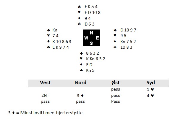 Nå fikk jeg belønning, fordi etter å ha tatt ut trumfen tok jeg for to høye spar og oppdaget at sparen satt 4-1. Jeg tok for ruter ess og var sjeleglad for enda å ha ruterdamen i behold. Den brukte jeg til å spille inn vest og fikk det tiende og kontrakten når han måtte spille til dobbelrenons. Tre tapere i minor var alt!