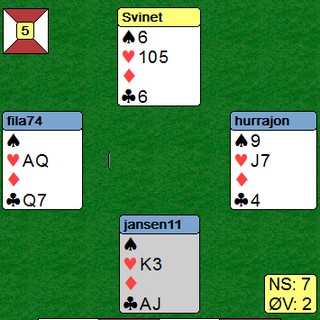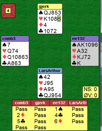 3ru benektet fem hjerter, men viste fire ruter (trodde vi). Med vår gode rutertilpasning, tok vi sjansen på slem.