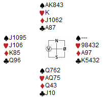 Dette spillet er rapportert inn fra singel-turneringa på tirsdag, og sjeldent ser vi lignende finesse i spillet. Tord er en av våre nyere spillere, og viser stort engasjement og interesse i spillet selv om det nok fortsatt trengs litt øving før overstikkene sitter der de skal. På tirsdag briljerte han imidlertid med en ny type sperreåpning, og det var mer enn nok til å spille Odd Helge ut på sidelinja. Du kan først få alle korta og tenke ut i hvilken himmelretning Tord kan ha plassert seg for sin svake sperremelding på 2-trinnet: