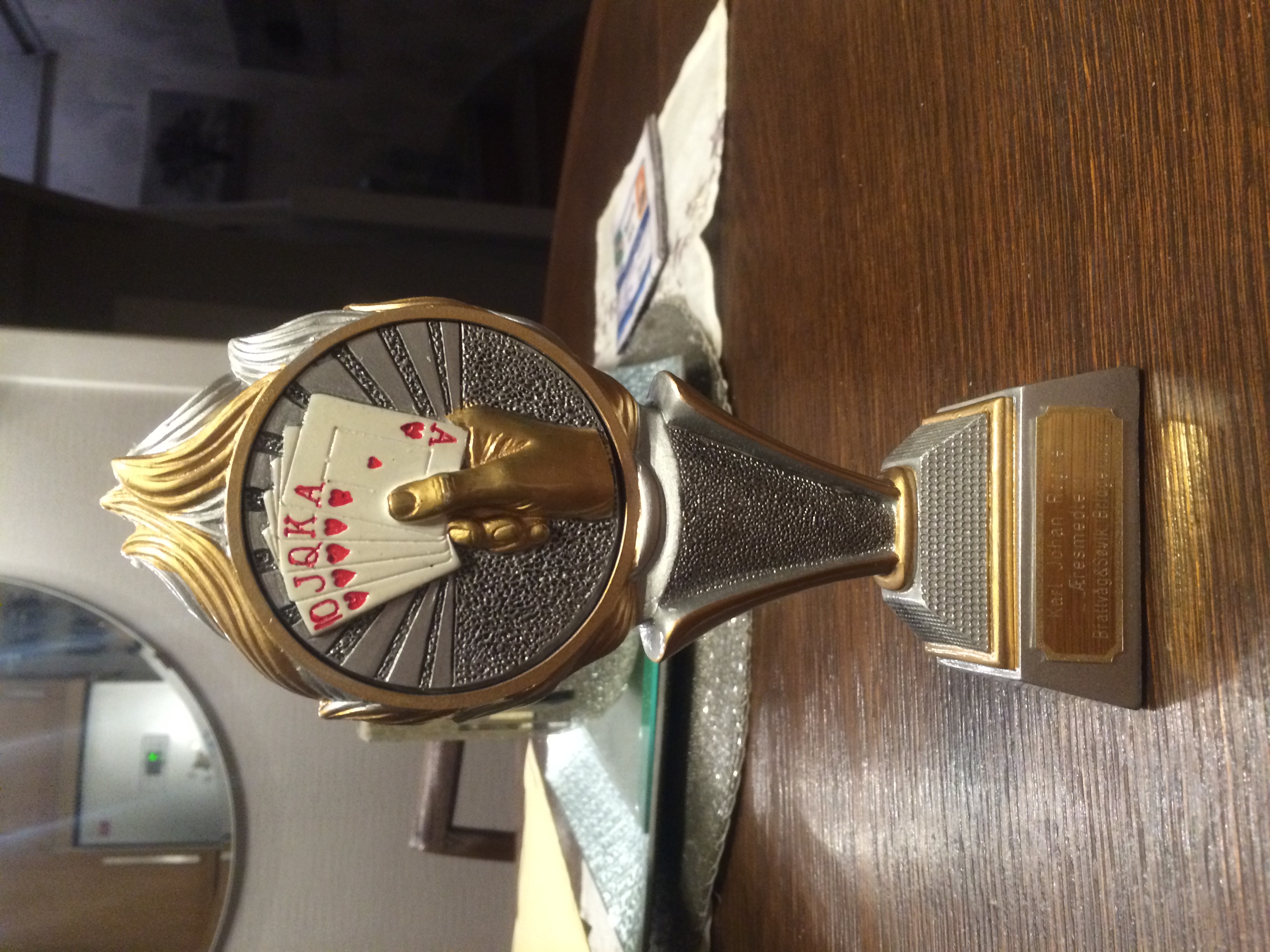 Ble idag tildelt statuetten som bevis på att han er utnevnt til Æresmedlem i Brattvåg&Søvik Bridgeklubb.Det var en stolt og glad Kalle som tok imot statuetten.Ett meir verdig medlem til å få denne statusen skal vi vel leite lenge etter. Kalle har vore en bauta i klubben i alle år og ej er sikker på alle i klubben stemmer i sammens med meg: Gratulerer kjære Kalle, det er deg vel unt. Kalle ba meg også hilse til ALLE i klubben og takke så masse.