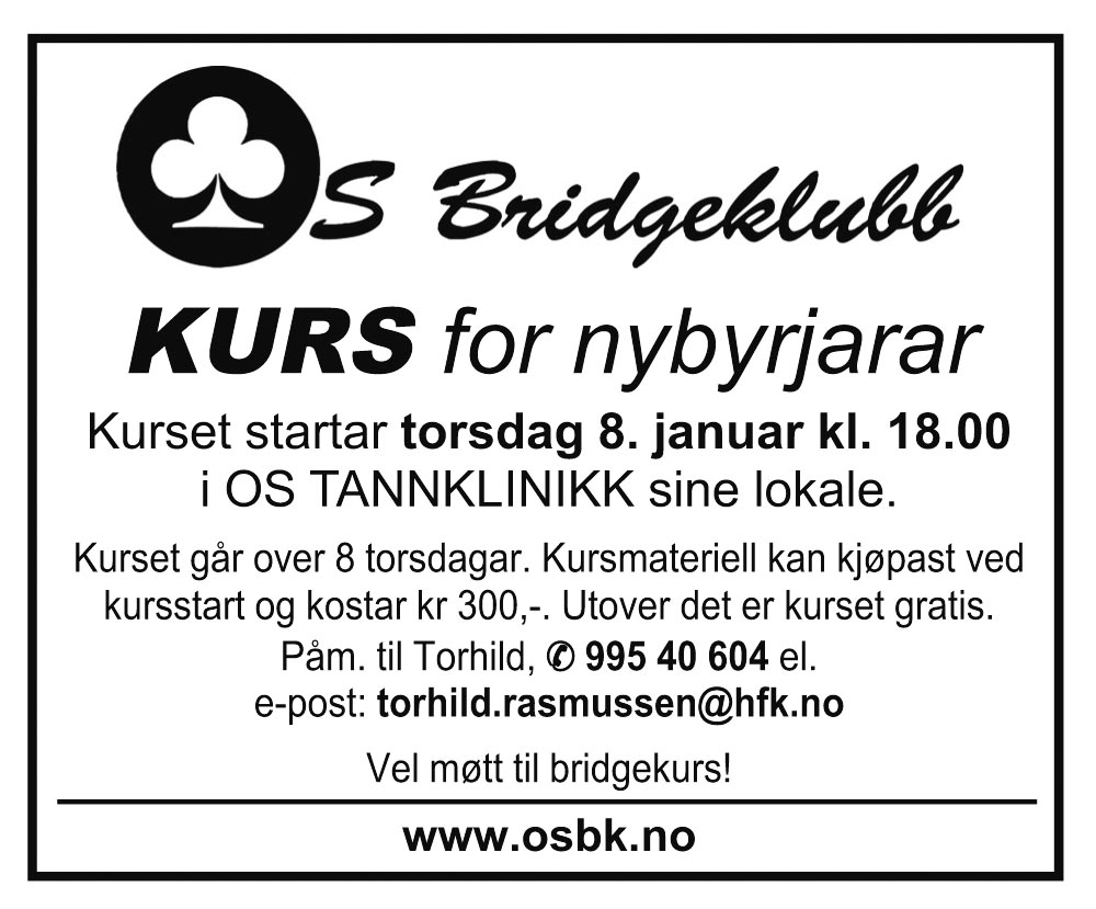 Os BK arrangerer juleturnering 28.12 på Os Eldresenter. Start 12:00. Pris 250 per spelar. Påmelding til Leif Juvik 93840376 el. leif.juvik@osogfusa.no el. NBF påmeldingsmodul.