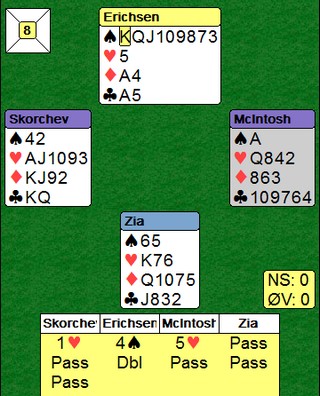 I England foregår semifinalen i Gold Cup og der spiller norske Espen Erichsen på lag Gillis. De har også med seg Zia. I spillet under var det en engelskmann som var svært dyktig som spillefører.
