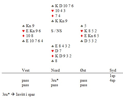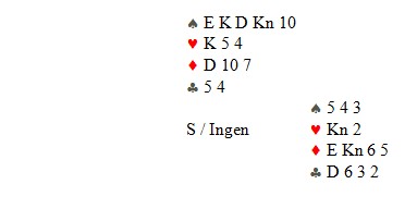 I dette spillet åpner syd med 3hj og nord løfter til 4hj. Makker spiller ut kløveresset som du legger svakhet på. Du ser at i dette spiller får dere sannynligvis ikke mange sjanser. Tar dere minorstikkene i feil rekkefølge, vil syd oftest ta resten av stikkene. 1. Makker skifter til ruter 3 og bordet legger tieren. Ruter tre er et lite kort og forteller derfor at han har ruter konge. I tilegg bruker ikke vi (i alle fall ikke jeg) fordeling i disse posisjonene, så treeren er hans minste kort. Jeg bruker knekten og spillefører følger på med toeren. Syd er en god spiller, så han vet hvilket kort han skal legge for å ødelegge for oss. Han følger med det kortet motspillerne sannsynligvis allerede vet han har. I andre posisjoner skal en som regel legge motsatt av motpartens signaler. I lag er dette ikke så vanskelig, fordi det ser ut som vi må ha fire minorstikk for å beite. Jeg tar derfor for esset og makker følger på med nieren og spillefører med syveren. Nå vet jeg at fargen er fordelt med K93 hos makker (med K983 hadde han fulgt med åtteren andre gang, norsk fra gjenværende) og 872 hos syd. Vi har spilt nøyaktig for en beit når spillefører har 98, ED109876,872,7. Hvis makker følger med åtteren under ruteress, må du ut å gjette. Han kan ha K983 eller K83. Tror du mest på det første skifter du tilbake til kløver og håper spillefører har 2-7-2-2. Tror du på det siste, spiller du mer ruter. Åtteren som "kombikort" fra K983 tror jeg absolutt ikke er å anbefale. Kanskje det aller beste er å stikke med knekten og så spille femmeren tilbake, norsk fordeling fra gjenværende. Nå ser makker sannsynligvis alle småkorta og kan best vite om vi skal ta et ruterstikk til eller prøve å få for kløverkongen. 2. Makker skifter til ruter 9 og bordet legger tieren. Ruter 9 er et høyt kort og benekter ruter konge. Derfor stikker du med esset og skifter tilbake til kløver. Eneste beitesjanse er at syd har dobbel kløver og mangler hjerteresset, f.eks 98,D1098763,K2,98. Å bruke ruter knekt vil være katastrofalt når sparen sitter 3-3 hos dere. 3. Makker skifter til ruter 8 og bordet legger tieren. Ruter 8 er et kort du ikke kan lese. Det kan være fra 8432, 832, 842, 843 eller K98. Jeg tror det er mest sannsynlilg at han skifter fra der han har noe (ellers ville han sannsynligvis tatt for kløverkongen før han skifter til ruter), så jeg tror det er best å bruke knekten og dermed ta det som da alltid er tre ruterstikk. Hvis åtteren er invitt, er det eksakt K98 fordi med f.eks K982 ville han spilt toeren tilbake. Makker har aldri 9832 fordi da ville han spilt nieren, det høyeste kortet som er "ledig". 4. Makker skifter til ruter 2 og bordet legger tieren. (se kommentar for rettelse) Det er alltid er stor fordel å se det minste manglende kortet i motspill. Igjen vet du makker har kongen så knekten din står. Spillefører følger med åtteren. Du tar for esset og makker legger treeren og spillefører nieren. Du vet at makker har K432 fordi han har lagt fordelling fra gjenværende. Derfor skifter du tilbake til kløver fordi du vet det er ikke flere ruterstikk å hente. Hvis makker følger med fireren andre gang og spillefører fremdeles legger nieren, vet du at spillefører han gjemt treeren. Makker har da K42 og du tar enda et ruterstikk. Signaler i motspill når du ikke ser de minste kortene, er oftest ikke entydig. Spillefører vil ofte kunne manipulere ved måten han følger på med sine småkort. Det er derfor det ikke er noe særlig poeng med å bruke fordeling inne i spillet. Hvis du ikke ser toeren vil makkers treer kunne være fra både f.eks K732 og K73. Jeg vet at Nils Kvangraven og Terje Lie spiller noe som heter "2nd & 4th". Det betyr at de spiller sitt nest høyeste kort når de ikke inviterer, men fjerde høyeste når de han en honnør. Dette tror jeg opprinnelig er en svensk "oppfinnelse" og jeg inviterer Nils til å fortelle mer.