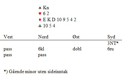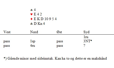 Jeg er litt skuffet over at norsk-afrikaner Stabell ikke har løst den forrige (under), men han (og dere andre) skal få en til. Hva melder du over makkers 4ru?