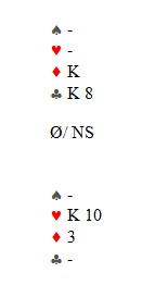 Jeg fikk kløver 9 ut til damen og skift til en liten spar fra Stig Drangsholt. Etter å ha spilt mot han i mange år, vet jeg at i slike posser har han esset og ikke damen, så jeg går opp på kongen og spiller mer spar til klukken sin dame. Jeg vet også at nå sitter ikke ruteren 6-1 hos motparten. Da hadde øst spilt den fargen og ikke spar. Det ser ut som øst har hjerterdamen, fordi spar ess og ED i kløver holder ikke til åpning. Med åtte poeng (to damer og ruter ess) ville vest sannsynligvis meldt første gang. Inne på spardamen kommer det kløver 7 til stjeling hjemme. Jeg stjeler en spar og esset faller i øst. Nå kan jeg ikke stjele meg hjem i i kløver enda, så jeg spiller en ruter til tieren og esset i vest. Det kommer mer ruter til min dame. Øst følger to ganger. Nå ser jeg den vinnende planen. Spar til stjeling med hjerter ess. Så hjerter knekt som seiler rundt. Kløver til stjeling med hjerter åtte og jeg frir meg med ruter. K10 tar de to siste og jeg vinner kontrakten. Ser ikke det litt småpent ut da? Jeg spiller sparen min, men vest har ikke mer. Øst har altså falsecardet fra E10 igjen, men det er ikke så farlig. Jeg stjeler med hjerter knekt, tar for hjerter ess og stjeler meg hjem med kløver til hjerter åtte. Vest kaster en ruter. Nå er stillingen: