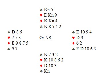 Tidlig i spillet hadde jeg plassert sparlengden og ruterlengden i vest. Derfor hadde øst hjerterlengden. Det var den tanken som aldri slapp. :-) Hadde jeg tenkt meg bitte-litt om, hadde øst vist fire spar, dobbel ruter og fem kløver. Hvis han i tillegg skulle ha hjerterlangde, hadde han enten fordelingen 4-4-5-2 eller 4-3-2-5, henholdsvis femten og fjorten kort. Selvsagt MÅTTE han ha 4-2-2-5 og hjerterdamen dobbel. Det var bare å ta for K10 i hjerter og hente det tiende i ruter. Kun et overstikk i lag, men ikke rart at makker hadde vansker for å holde seg alvorlig. Her er alle kortene