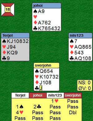 av Bard Olav Aasan Jeg skal hjelpe deg litt i gang,( selv om det finnes flere mulige spilleplaner). Du stikker med hjerterkongen og tar for sparesset. Knekten faller til høyre. Nå vil jeg tro mange spiller hjerter til esset og stjeler kløveren med nieren i bordet. Så trumf. Ser ikke dette enkelt ut nå da? Nei, du har oversett et fint lite poeng. Hvis vest har Kxx i spar og singel ruter, kommer du deg ikke hjem for å ta ut trumfen når han skifter til ruter! Det unngår du elegant ved å ta for en ruterhonnør før du spiller trumf. Ja, det kan bli galt med ruteren 5-0, men 4-1 er tross alt mye mer sannsynlig. mvh BOA
