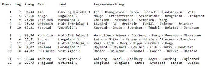 Resultater etter første helg: Det svinger fort i lagbridge, men 10 VP er en fin ledelse for Møre og Romsdal. De to beste har ikke møtt hverandre enda og jeg mener at Geir Helgemo er klar for den andre helga og Hauge. Kan det vippe Rogaland sin vei? Jeg tror det ikke. Ellers er det jevnt som bare det om de andre medaljene og før siste kort er lagt er det mange som har vært oppe og snust. Lutro overrasket positivt første helg, mens vegge Vest-Agder lagene skuffet noe. Denne ganger er det ikke barndåp for undertegnede, så han har planer om å avansere voldsomt med sitt lag. Kamper sendes på BBO fra lørdag morgen, så det er bare å følge med.