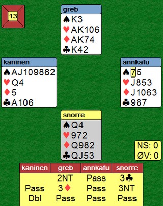 Makker finner det perfekte utspillet av singel kløver, og etterhvert har vi lurt til oss fire dobla beter i sonen for 1100 inn og 133 og ensom topp på landsbasis.