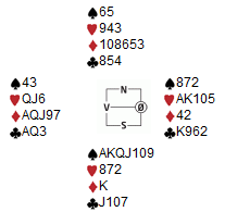 Syd åpnet 1 spar ved bordet til Odd Harald og Geir. 2 ruter fra Geir, og Odd Harald vurderer riktig når han nå melder 2 hjerter til tross for "bare" 4 kort. Vest har normalt ikke 4 kort hjerter i dette meldeforløpet. For vest blir det nå enkelt å melde ut i 4 hjerter. 11 stikk på Moyse tilpasning.