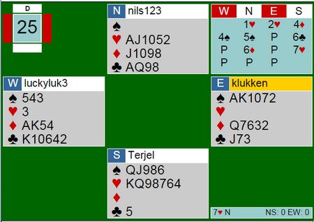 Når jeg sitter og melder, har jeg (dessverre) en tendens til å la negative tanker ta meg. Som for eksempel at makker neppe har akkurat de kortene jeg trenger. Nils Kvangraven tenker motsatt og leiter kun etter de positive faktorene. 4ru og 5sp viser begge renons. Når Terje så cuebider 6kl, tror selvsagt Nils av det er kongen og hånda hans vokser enda mer. 6ru er "last train" og betyr at han har ikke gitt opp 7hj enda, men kan ikke melde det selv. Syv trumf mente Terje Lie var nok og det stemte. 12 trumfstikk på kryss pluss kløveresset.
