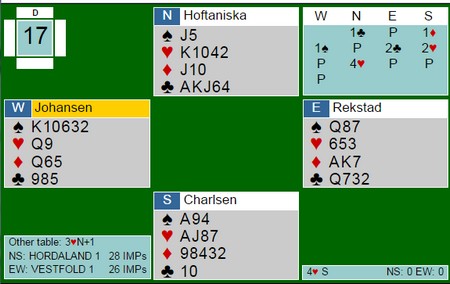 5-trinnet er vanskelig. Det er vel ingen av oss som har angret på aksjoner v har gjort. Tar vi ut er det feil og melder vi er det også galt. Her var det riktig å ta ut med vest sine kort. Konsekvensen er at de gangene øst sitter på beita i 4sp, må han passe fordi makker ofte tar ut. I alle fall de gangene han har llitt fordelilng. På det andre bordet gikk det likedan helt til doblingen. Der passet vest og måtte betale ut 590. Hvem at nord/syd som skal doble 5hj, vet jeg ikke. De har ikke peiling på om ØV sleminviterer eller stamper. Fin storeslem fra Berg - Austberg 3hj viser minst fem spar og 3sp viser trekort-støtte. Så forteller vest om tre av fem ess, kløverkongen og hjerterkongen. Det var nok for øst. Kontrakten er ikke nedlegg, men når kløverdamen falt tredje gang, var det tretten lette stikk. Spiller gikk ut i kampen mellom Vest-Agder og Hornslien når Brekka - Høiland også meldte 7sp I spillet under hadde Erik Berg uflaks for en gangs skyld. Her var det mange som kom til 6hj med EK i trumf vekk. Med sparkongen ut kan ikke 5hj vinnes heller fordi øst kommer ikke inn i tide til å få kvittet seg med spartaperen etter spar konge i utspill. Litt surt å vinne bare 1 IMP når motparten er i slem på andre bordet. Her sniffa Thomas Charlsen fint i 4hj. Trykk på spillet og velg spill 17.
