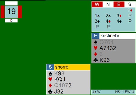 Når jeg ser på sjakk, klarer jeg ikke å tenke langt nok fram. Jeg er faktisk så dårlig at jeg sjelden klarer mer enn et par trekk før jeg mister oversikten. I bridge er jeg bedre, men i går oppdaga jeg akkurat den samme tilkortkommenheten som i sjakk. Jeg var en god stund fornøyd med ressonementet mitt, men i ettertid holder det ikke vann. Du har selvsagt ikke noen problem med slike spill Makker spilte ut ruter to, norske utspill, til dame og ess. Så ruter til stjeling, spar til esset (makker hadde knekten), ruter til stjeling og spardamen fra bordet. Nå er stillingen: Jeg ser at hjerteren sitter 3-3, så derfor virker det som det haster å få fjernet kløveresset som inntak. La oss si jeg spiller hjerterkongen som står, så mer hjerter til esset og hjerter til stjeling. Ut med min spar ni og kløver mot kongen. Der ligger to hjertertasser og venter. Derfor skifta jeg kløver knekt som gikk til kongen. Men tell trumfen da, Snurr!! Spillefører har spilt to ganger og må bruker en tredje for å fjerne min nier. Hvis jeg i posisjonen over spiller ruter, går den fjerde trumfen. Den femte må han bruke på å stjele god hjerteren og når spillefører prøver å komme seg inn i bordet, stikker makker rett og slett med esset og har den trettende ruteren for beita. Akkurat som i sjakk. Jeg tenkte ikke langt nok fram. Skuffende!! Spillefører kan alltid vinne ved å finne kløveren og hun burde også gått på hjerteren tidligere. Det har ingenting med saken å gjøre i denne sammenhengen.