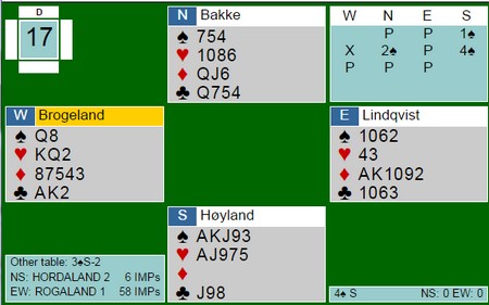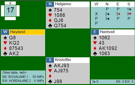 Espen Lindqvist på det andre bordet fant ikke ressurser til å melde 3ru og da gikk det sånn. Trykk poå spillet og velg spill 17, lukket rom.