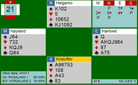 I dette spillet ble øst sin melding helt avgjørende for motspillet. Trond Hantveit i øst hjalp makker Sam Inge Høyland med ruterutspillet og da var Christer Kristoffersen sjanseløs. Han gikk en æresbeit når han bomma kløveren, men 3sp kan han aldri vinne når ØV spiller ruter hver gang. Trykk på spillet og velg spill 17, åpent rom.