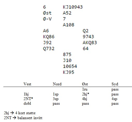Når motparten bruker overføringsmeldinger etter åpning 1kl, gir det oss muligheten til å vise en farge billig. Det er oftest en fordel, men ikke alltid. Nils Kvangraven doblet Boye Brogeland sin 1hj (som viser spar) for å fortelle om at han ville meldt inn 1hj. Nå var det kun valget mellom pest og kolera igjen. 1hjxx ville stått i omtrent ti stikk og 2ru kosta egentlig 1400 i beit. Nils "slapp" med 1100, men det var grisedyrt mot 480 i 4sp på det andre bordet. Geir Helgemo i syd-åpent rom, var også en stund i 2kl i syd, men slapp unna sine 1100 i beit. _____________________________________________________________________________