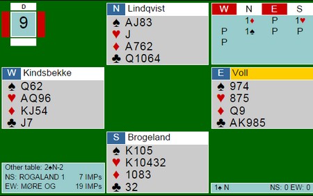 Hvis er ser isolert på resultatlista fra Seriemesterskapet, virker det som Hauge tok en klar seier. Det er langt fra tilfellet, fordi det var noen yderst få spill i siste kampen som avgjorde. At Nils gikk 1100 i 2rux er litt tilfeldig og uheldig. Det er nok i ingen vits å melde seg på i slike spill, i alle fall med en passet makker, men vi har gjort det alle sammen ustraffet. En vinner ikke i bridge ved å tro at en skal passe seg til seier, men dette var i alle fall ikke gangen å doble 1hj. Spillet under er et spill der Boye Brogeland vurderer bedre enn Asbjørn Kindsbekken. Boye spiller ut hjerteress, mens Kindsbekken inviterer. Med sparesset er det liten vits i å spille ut en liten hjerter. Spillefører har ofte bare Dx i hjerter og da er det viktig å ikke gi bort stikk for den. Forbindelsen har ØV i spar hvis øst skulle hatt f.eks Knxx i hjerter og syd Dx. Eller som sitsen er her. Motparten har ikke invitert, så det er meget mulig at de har åtte minorstikk når de kommer inn. 13 fortjente IMP. I første halvrunde vant Hauge syv spill med små IMP'er, blant annet tre femmere. De er også viktige, spesielt i innbyrdes oppgjør. I lagkamp må en være mye forsiktigere enn i par, men det går ikke an å være for passiv heller. Boye var flink og passet ut 1sp og vant akkurat syv stikk. På den andre bordet kom NS i 2sp med en beit. 5 IMP. Jeg vet ikke om vest bør melde 1NT i utdøende over 1sp, selv i lagkamp. Denne gangen vinner ØV lett 1NT. Hadde det vært feil å melde 1NT i vest i utdøende. f.eks hvis nord hadde vært sterk og kunne doblet for å vise tillegg, hadde jeg vel skrevet "GALEMATIAS" når Kindsbekken betalte ut 800 i stedet for 80.