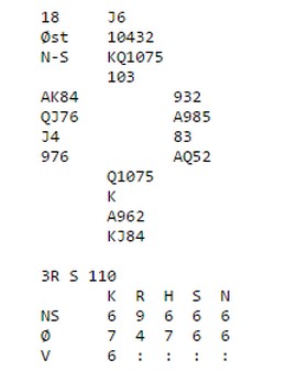 Du spiller 4 hjerter som Nord etter at Vest har vært inne med sparmelding, Øst spiller ut spar to til nieren, som du godt kan sitte over, og så stiker du den andre sparen. Ruteren må orne seg på et vis , så i stikk tre spiller du ruter til knekten som holder. Hva nå? Sitter ruteren 3-3, er alt i orden, men hva med 4-2? Du kan øke sjansene dine ved å ta ruter ess. Deretter hjerter ess, konge og så ruter konge. Sitter den 3-3, tar du ut siste trumf. Hvis den ikke blir stukket med trumf, stjeler du din fjerde ruter med med bordets siste trumf. Motparten hadde: