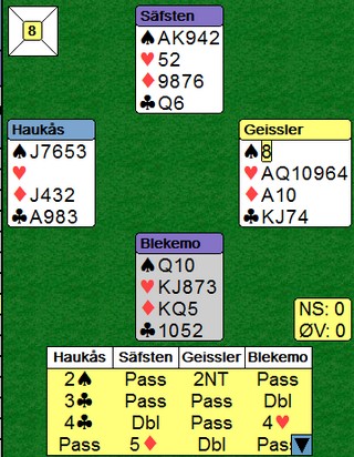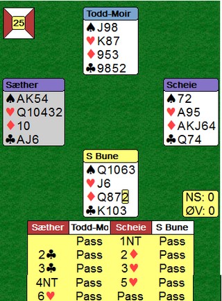Gode norske valg Du skal spille 6hj i øst og får et heldig ruterutspill til tieren som står. Når du ser alle kortene, vinner du lett tolv stikk, men jeg er ikke sikker på hva som er statistisk beste spilleplan. Markus Scheie valgte å stjele to spar i bordet. Han kaster derfor to kløver på EK i ruter og spilte seg fram til denne posisjonen. Pang og ned med hjerterdamen for +1430. Alternativ spilleplan er å kaste en spar og en kløver på EK i ruter. Da holder det å stjele en spar og du kan ta for hjerteresset og spille hjerter mot damen. Da må en ta kløverkappen. Denne gangen går den og hjerteren kommer av seg selv. Det kan godt hende Markus Scheie sin plan er like god. Den står på å finne riktig hjerterhonnør dobbel, pluss at nord bør helst ha bare tre spar. ____________________________________________________________________ Joakim Sæther og Markus Skeie ser ut til å komme til finalen i U20-klassen i Nordisk 2015. Her var det danskene som var bedre enn de norske Poenget er danskens 3hj, sperr, over 1sp. Nå fikk ikke øst splintret i ruter og måtte derfor nesten melde 4sp. På det andre bordet passet norske Ole Andre Haukås i nord og etter 4ru kom danskene i den glimrende sparslemmen. Det ser skummelt ut å sperre uten kort i ugunstig, men min erfaring er at en svært sjelden blir tatt etter slike stund. ___________________________________________________________________________ Dette er IKKE lagbridge! og danskene tok opp konkurransen mot en delkontrakt i kløver. Det kostet 1400 i beit på 5-trinnet. De juniorene, de juniorene! Norge hadde også et dårlig resultat på dette spillet. Norske nord åpnet med 2sp og øst meldte inn 3hj. Syd doblet (!) og måtte spille med knvien på strupen for å beite. Har motparten mesteparten av honnørstyrken og er i en kontrakt du ser neppe er den beste, er det bare å passe å ta inn plussen. Det er jo heller slettes ikke sikkert at meldingene er slutt på 3hj. Danske øst spilte veldig bra i 3hj x, og lusket hjerter ni fra hånda. Syd ble grådig og la liten. Så hjerteresset og så ble syd strippet for frikort. -530, men det var ikke så farlig mot 1400 inn på det andre bordet. Ikke farlig når motpartens hjemspilte doble delkontrakt gir 13 IMP inn.