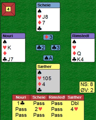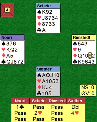 Skal en gjøre det bra i bridge, er en avhengig av noe hjelp fra motparten. Det som er viktig, er å ta vare på muligheten når den plutselig er der. Markus Scheie fikk ruter ut til knekten, esset og mer ruter. Så hjerter ess og mer hjerter. Vest gjorde en aldri så liten tabbe når han ikke tok av seg den andre trumfhonnøren, men skifta kløver. Scheie tok for kløveresset, stjal en kløver og spilte fire ganger spar. Vest skjønte hva som var i ferd med å skje, så han lot være å trumfe. I posisjonen under fikk han komme inn på hjerterkongen og det var ingen mulighet å få tak i ruterstikket lenger.