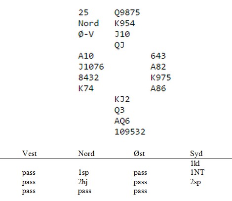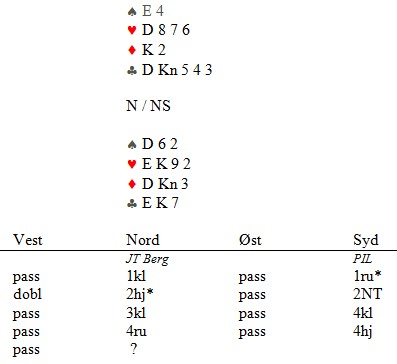 Jeg hadde en glad og opprømt Jan Tore Berg på telefonen i dag. "Alle gode ting er ....... 25!". Med det mente han at han hadde spilt NM klubber 25 ganger og aldri kommet til finalen. Det er dårligere spillere enn JTB som har klart den prestasjonen på langt færre forsøk. "Har du er spill til meg?", spurte jeg som vanlig og da kom han med dette som jeg likte godt. Poenget er at etter 1ru (som viser hjerter) kan han melde 1hj fulgt av 2hj for å vise en god 12-14, mens hopp til 2hj viser minimum. Jeg vil anta at de fleste mener at den aktuelle hånda ikke er minimum, men se hva som skjedde videre. 1ru viser hjerter 2hj viser firekort hjerter og en minimumsåpning Per Erik Austberg meldte 2NT som en generell utgangsinvitt. Nå viste Jan Tore fram kløverfargen og PIL støttet for å vise en mildt sleminvitt. 4ru er cuebid og 4hj betyr at hånda er tømt. Nå kom fordelen av å ha litt i reserve. Når makker kunne sleminvitere mot en dårlig åpning, kan han ikke passe 4hj. Derfor ga han makker enda en lillefinger med cuebid i 4sp og da gikk syd i Blackwood. Trumfen satt 3-2 (66%) og de ble belønnet. Jeg tror mange spillere har noe å lære av å ikke rulle ut hele kuken bare for å pisse. Det kan være godt å noe i reserve til andre (og bedre) anledninger. Viser du den aktuelle hånda som maksimum, vil du bremse og bremse resten av meldingsforløpet fordi du føler at du allerede har strukket kortene. Det er da viktig at makker på den andre siden ikke gir helt opp om makker viser minimum. Noen ganger kan han ha "maksimum av minimum" og ikke alltid "minimum av maksimum" i stedet.