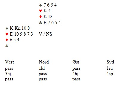 "Moderne" bridge har blitt mer og mer aggressiv, men hvor går grensene? Parturnering I første hånd med ingen i sonen og du har KKn108 E109876 43 4 Du får 100 poeng å fordele på disse meldingene: A: pass B. 1hj C: 2hj (svake to) D: 3hj Nok en gang gleder jeg meg til å høre fra dere. Heller ikke denne gangen har jeg sterke meninger, så det er bare å utbrodere ________________________________________________________________________