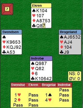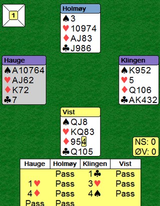 Kløver ut til konge og ess på begge bord: Vi som ser alle kortene tar for EK i hjerter og claimer ti stikk, men beste spilleføring gir faktisk beit. 4-1 sits i hjerter er større sjanse enn 5-1 i ruter, så derfor er det nok riktig å ta hjerterkappen for å gardere seg mot D10xx. Om en skal legge ned kongen først (singel dame i syd) eller spille liten til knekten (få med D10xx på begge hender) er jeg ikke sikker på. Begge bord kappet hjerteren og fikk ruterstjelingen på seg. Litt uflaks..