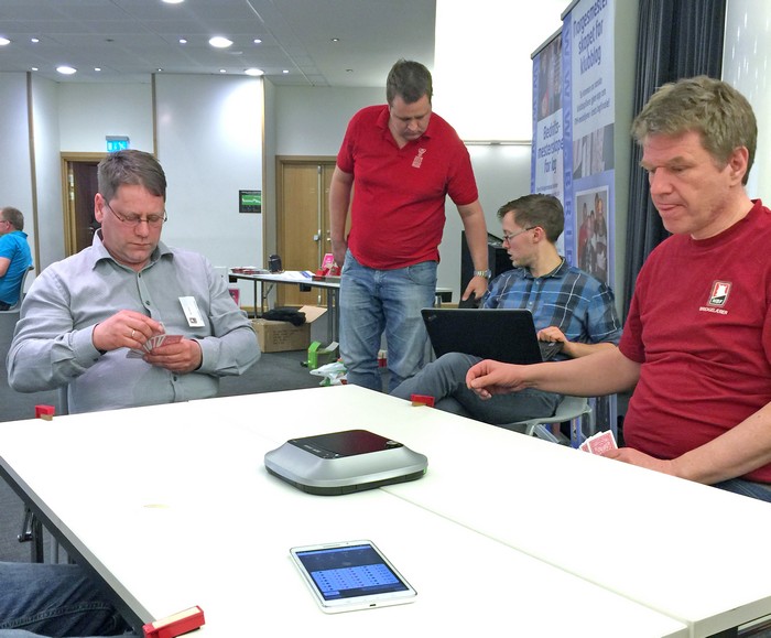Før vi startet spillingen ble navn på hver spiller skrevet inn på tableten. Det går fint til ”husbruk”, men skal systemet tas i bruk av norske klubber må det nok håndtere spillernummer hos NBF, slik at mesterpoengregistrering kan gå automatisk som vi er blitt vant til gjennom bruk av Ruter. I følge Kren Erik Nielsen, som var Bridge Companys mann på Gardermoen, lar dette seg greit løse, og i Damnark “snakker” alt Bridge + more med det danske forbundet.