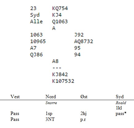 Leser dere lenger nede, ser dere "oppgaven". Her er slik jeg og Roald meldte, men jeg skammer meg. Det som i parturneringa vi spilte ikke var så farlig, var at alle de andre parene var også i 3NT, så det hele endte med middels for to sonebeiter der 6ru er nedlegg. Gautis eller dere andre: Hvor er feilen? Pass over 2hj viser maks dobbel spar 3NT så ut som verdens mest naturlige melding, men det er kanskje ikke det? _______________________________________________________________________________
